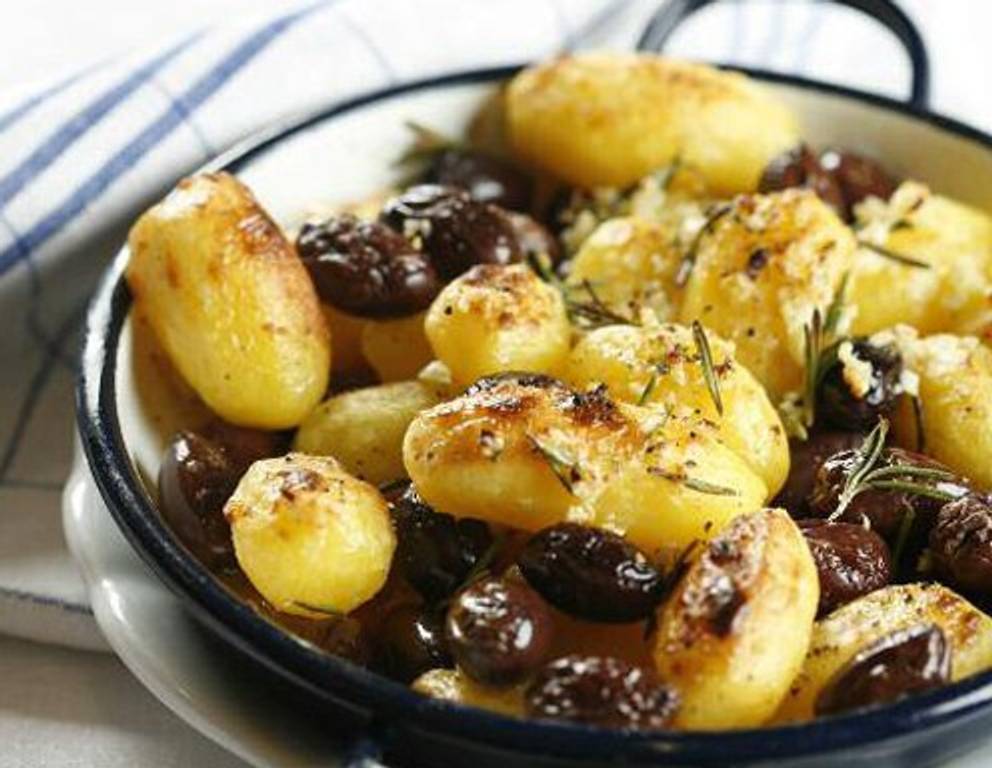 - Für die Kartoffelpfanne Knoblauch schälen und grob hacken, den Rosmarinzweig abzupfen und die rohen Babykartofffeln schälen. Die geschälten Kartoffeln in eine ofenfeste Form geben, sodass sie den Boden bedecken.