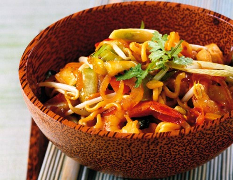 Rührt man anstatt der gekochten Nudeln am Schluss gekochten Reis unter die übrigen Zutaten, so entsteht das beliebte indonesische Gericht Nasi Goreng.