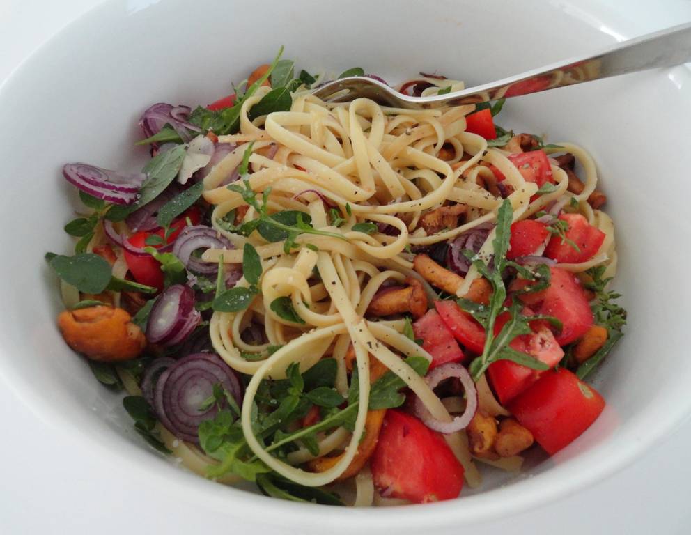 - Die Nudeln mit den Pilzen, Paradeisern und Rucola vermengen und mit Salz und Pfeffer würzen.