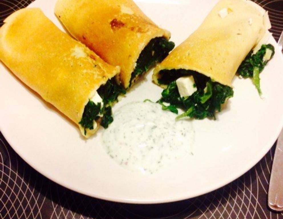 Die gefüllten Palatschinken mit Spinat und Schafskäse mit grünem Blattsalat anrichten.