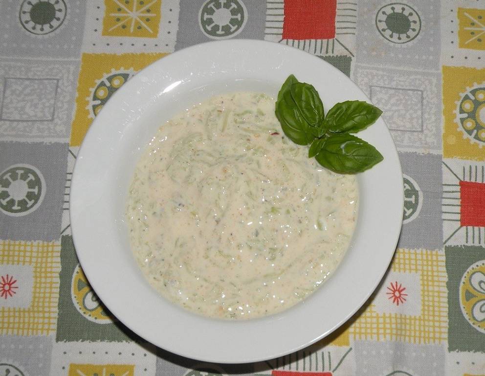 - (Wird eine Salatgurke verwendet, diese abschälen, halbieren, die Kerne herausstreichen und dann die Gurke reiben.) Küchenkräuter, Gurke, Joghurt und Olivenöl durchrühren. Mit Salz und Cayennepfeffer nachwürzen.
