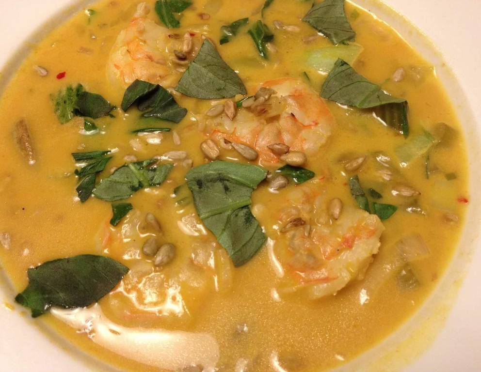 - Suppe in Teller geben, Garnelen hinzufügen, mit Kräutern garnieren und zu Tisch bringen.