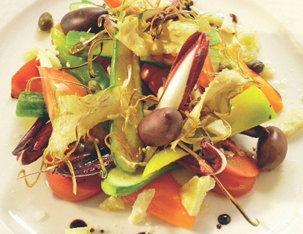 - Dekorativ auf Tellern anrichten, den geputzten Salat und die Oliven anlegen und mit Artischockenchips, Fleur de Sel sowie Parmesan bestreuen.