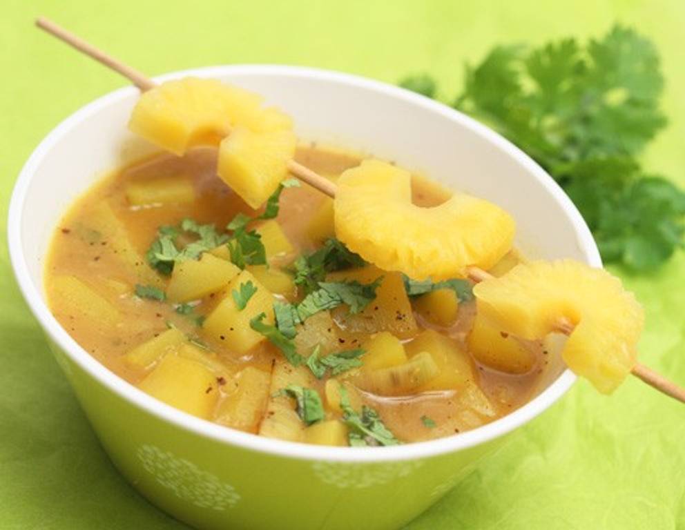 Die Kartoffelsuppe auf karibische Art mit frischer Ananas und Koriander noch heiß servieren.