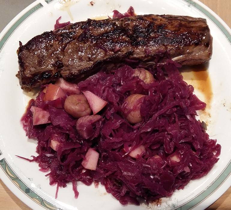 Dann aus der Pfanne nehmen und in Alufolie einwickeln und ruhen lassen (dabei gelegentlich wenden). Den schnellen Gamsrücken mit Beilagen wie Reis oder Maroni-Rotkraut anrichten und servieren.