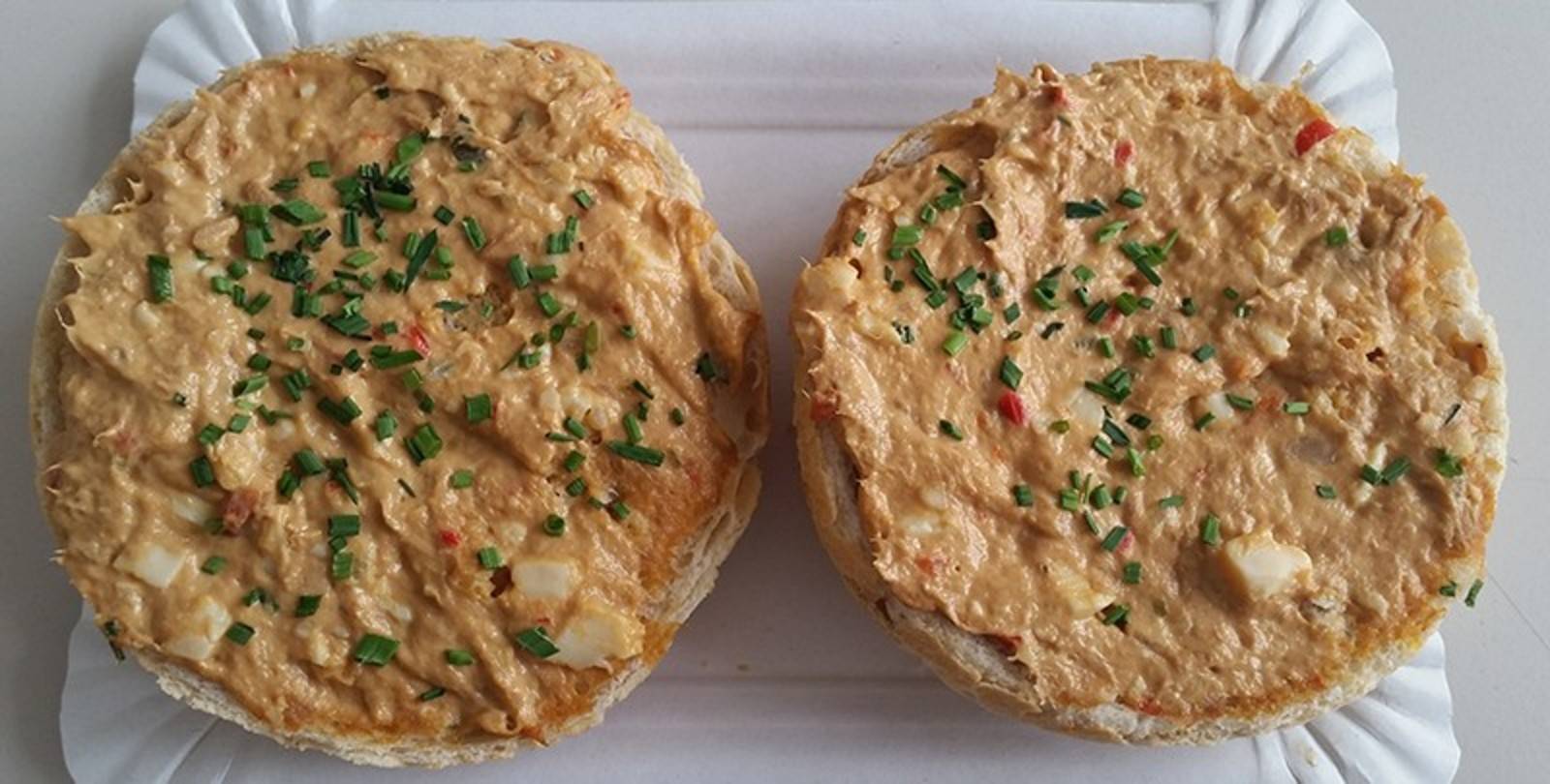 Für den Thunfischaufstrich den Thunfisch abtropfen lassen und zerpflücken. Die hart gekochten Eier, Zwiebel, Kräuter klein hacken. Den Paprika kleinwürfelig schneiden.
