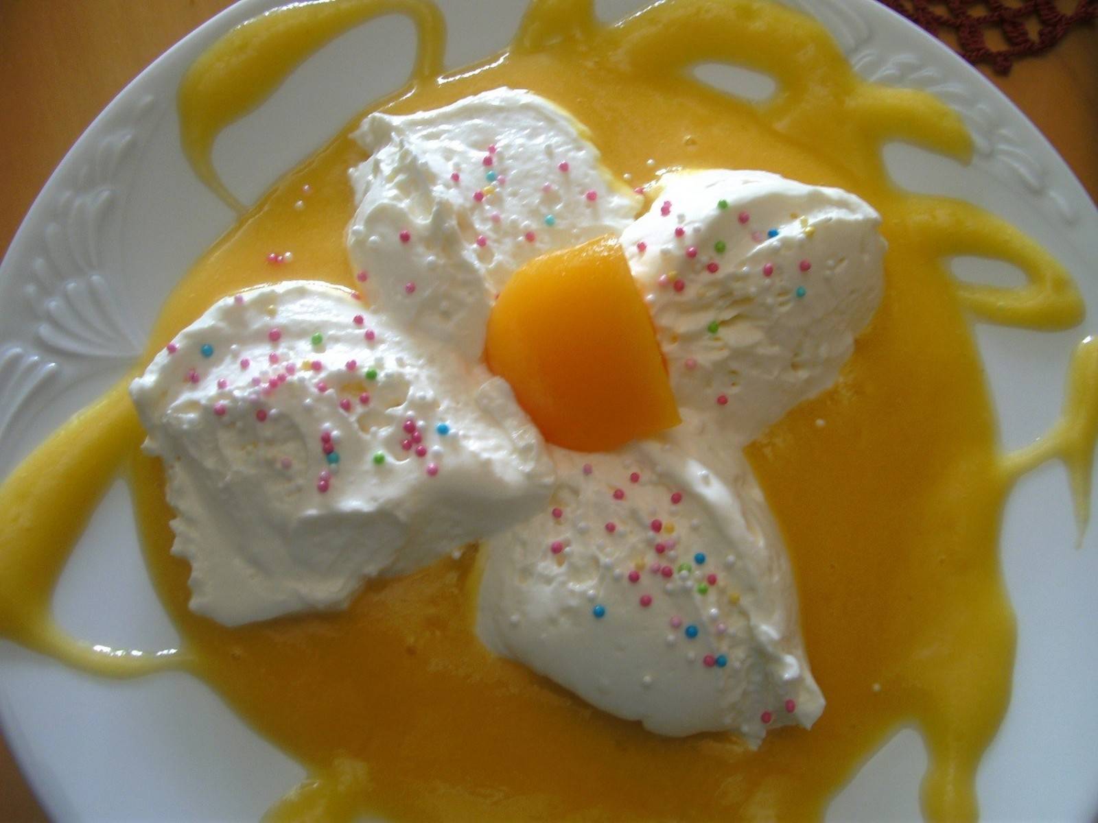 Birnen-Topfen-Nockerl auf Buttermilchcreme