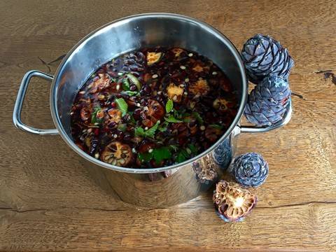 Zitronenschale, Saft, Zucker, die Kräuter und die Zitronensäure in den Topf dazugeben. Alles gut verrühren bis sich der Zucker aufgelöst hat. Zugedeckt 48 Stunden stehen lassen.